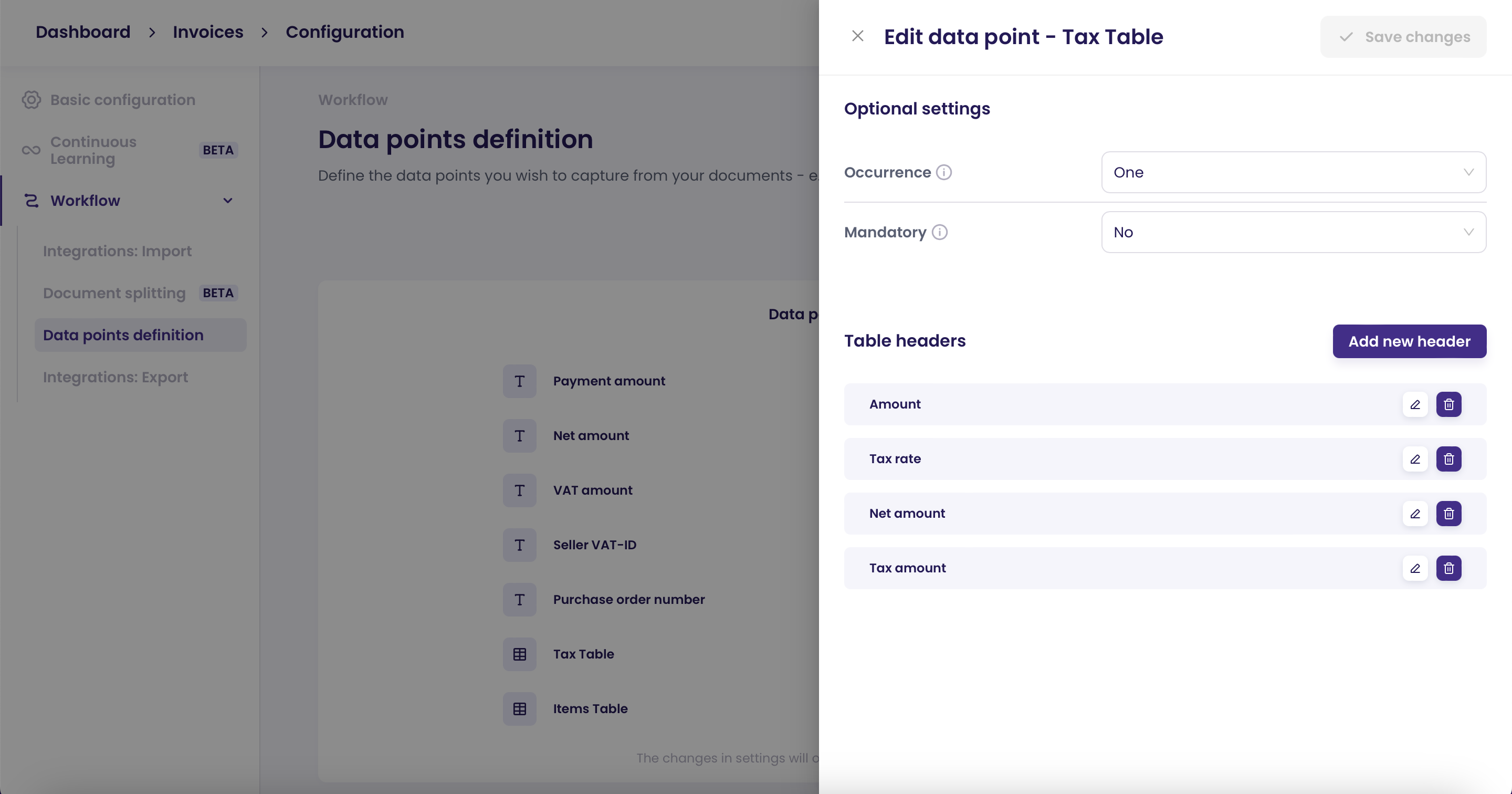 Adjust **the table data extraction** to your needs by editing already existing data points or creating new ones.