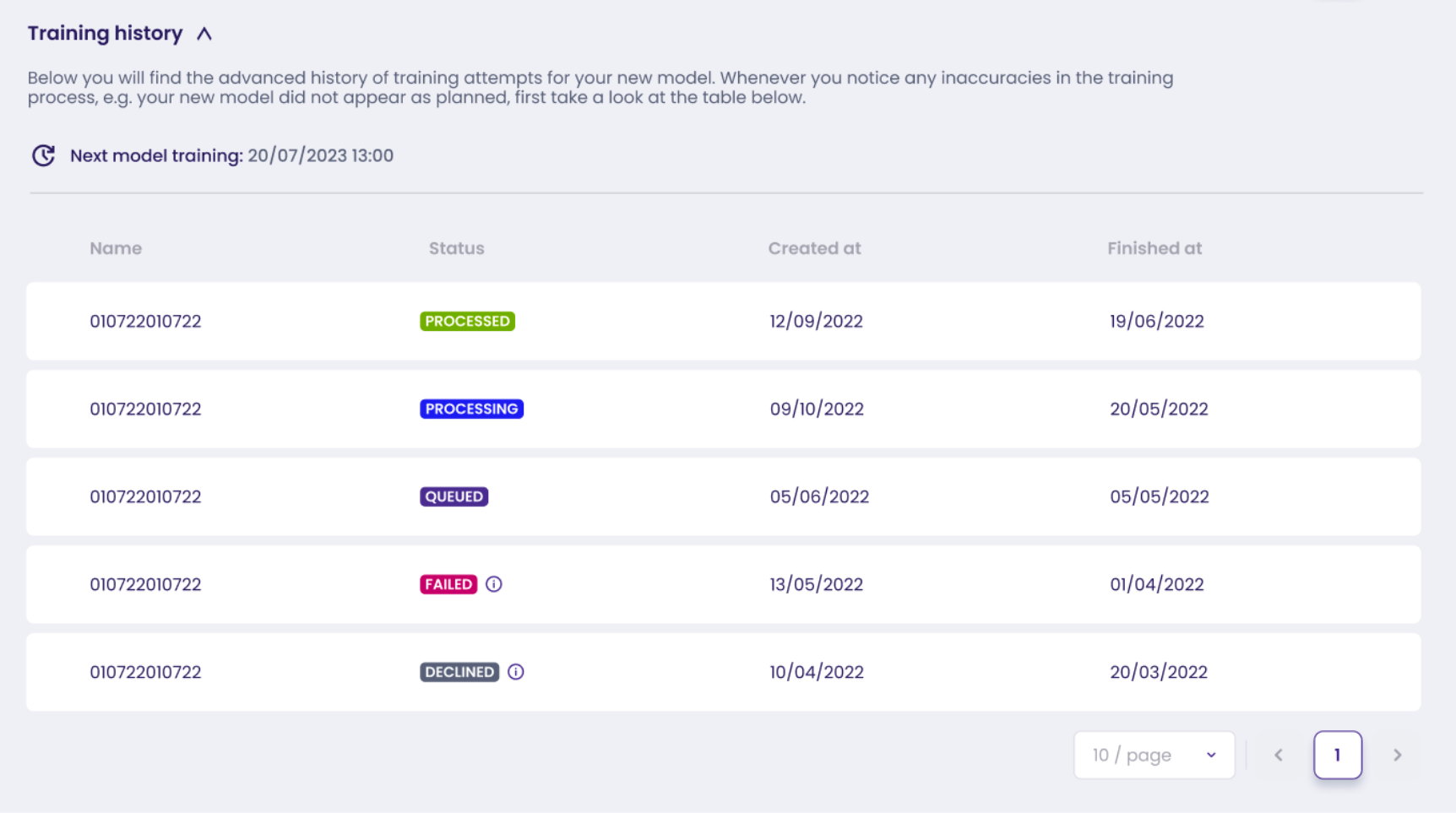 Below the models table you will the **history of model training attempts** showing training statuses, dates of creation as well as the date when model training has finished.&#x20;