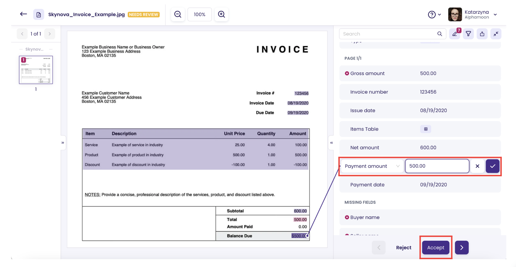 Note that Continuous Learning takes into account corrections from the documents with the "Accepted" status. You can read more about the review process [here](https://alphamoon.gitbook.io/documentation/~/changes/E5WHATIwrsF0u91xTwvD/user-guide-how-tos/supervision/how-to-edit-the-value-of-the-extraction).