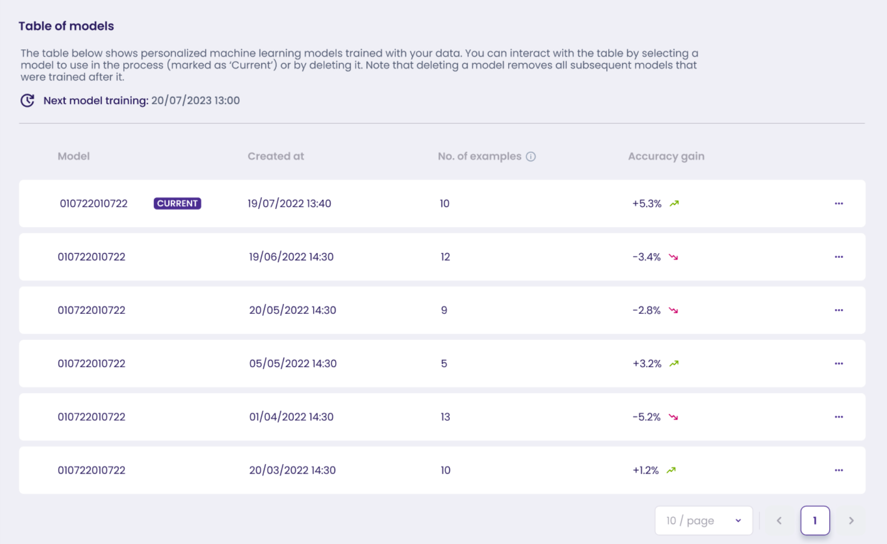 In the models table you can check when each model was created, how many examples it has (accepted collections) as well as the accuracy gain showing the overall training progress.